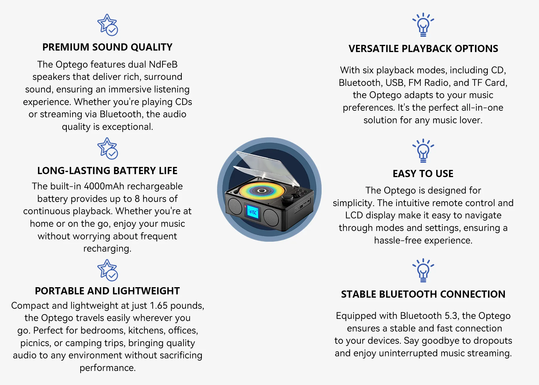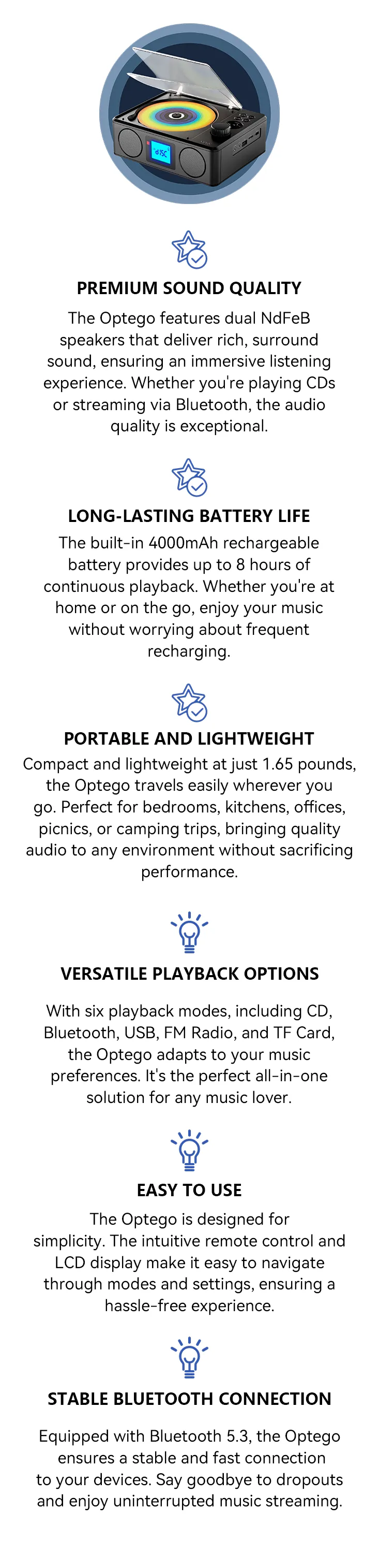 The Optego offers six playback modes, including CD, Bluetooth, USB, FM Radio, TF Card, and more. This versatility means you can enjoy your music in any format you prefer. Plus, the sleep timer function lets you drift off to your favorite tunes without worrying about turning it off.
