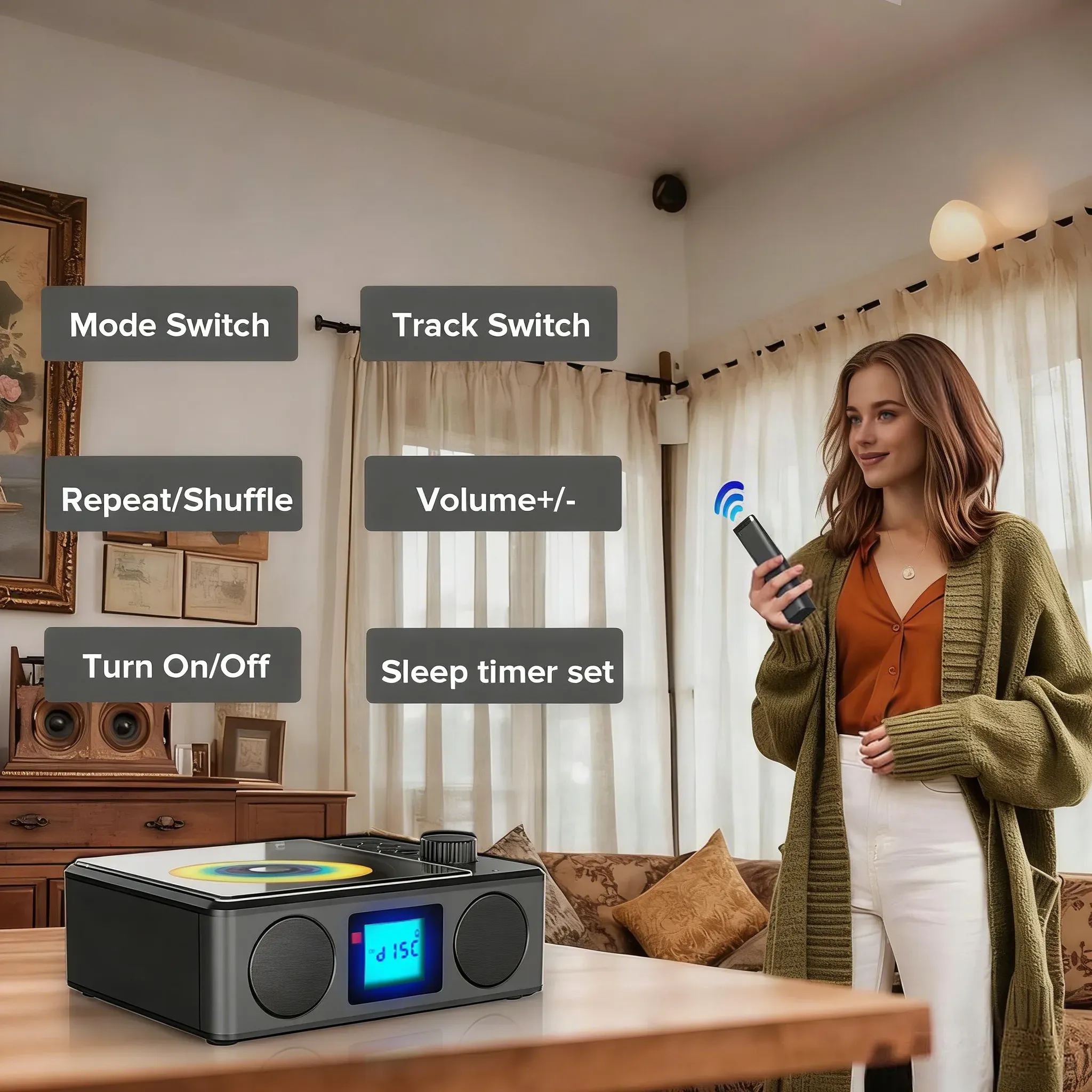 - Smart Remote Control – Effortlessly command playback, switch modes, adjust volume, change tracks, repeat/shuffle, turn on/off, and set sleep timer.